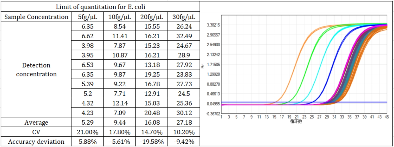 Leveraging proven TaqMan™ qPCR technology, this kit achieves a Limit of Detection (LoD) of 1 fg/μL and a Limit of Quantification (LoQ) of 5 fg/μL—enabling femtogram-level E. coli DNA detection that outperforms industry standards. With a regression coefficient of ≥0.999 for standard solutions and coefficient of variation (CV) <30% across all tested concentrations (5 fg/μL to 300 pg/μL), it ensures consistent, trustworthy data for critical QC decisions.
