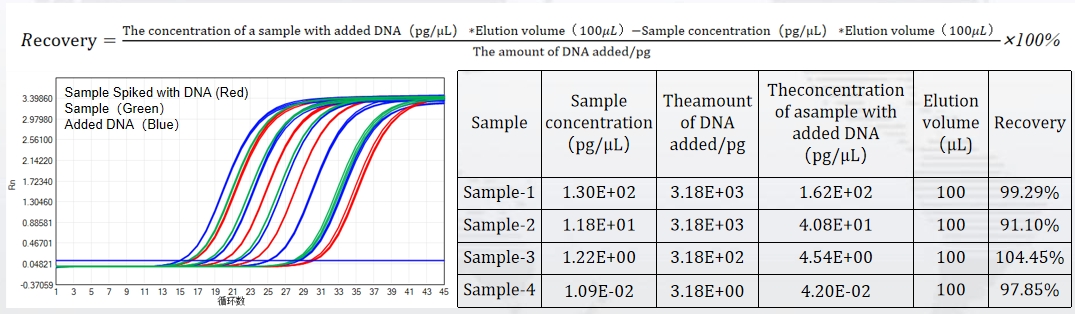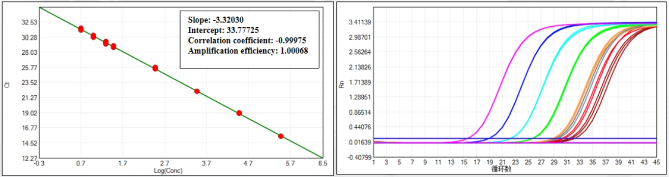 The kit offers a broad linear range from 5 fg/μL to 300 pg/μL, covering the full spectrum of residual DNA concentrations encountered in bioproduction. Spiked sample tests confirm a recovery rate between 70% and 130%—ensuring accurate quantification even in complex matrices. With an amplification efficiency of 100.068%, it delivers perfect amplification curves and consistent results batch after batch.