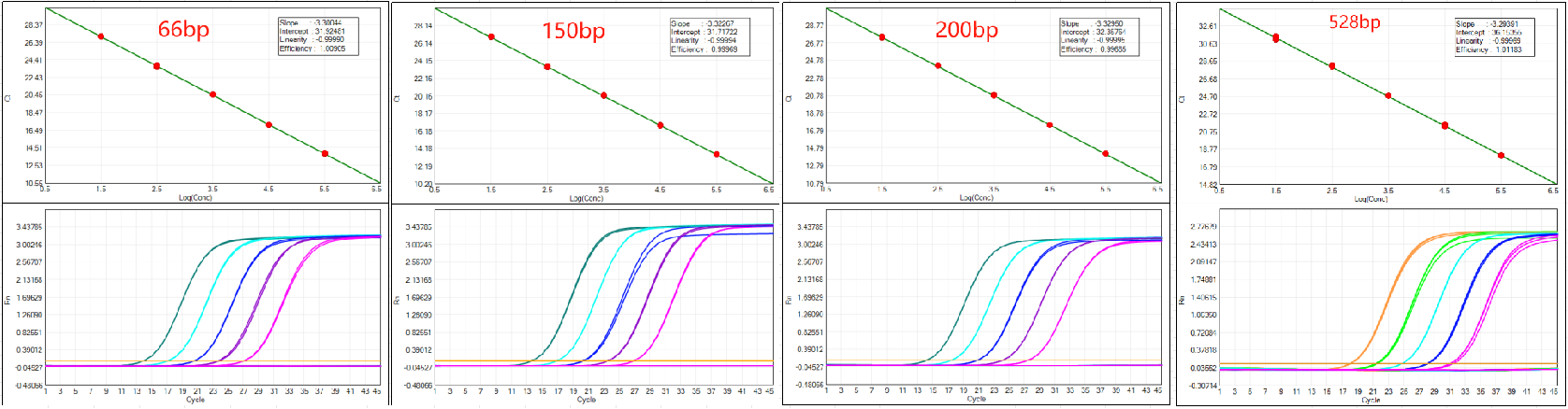 - Excellent amplification efficiency was observed, with the 500+ bp fragment showing nearly 100% efficiency